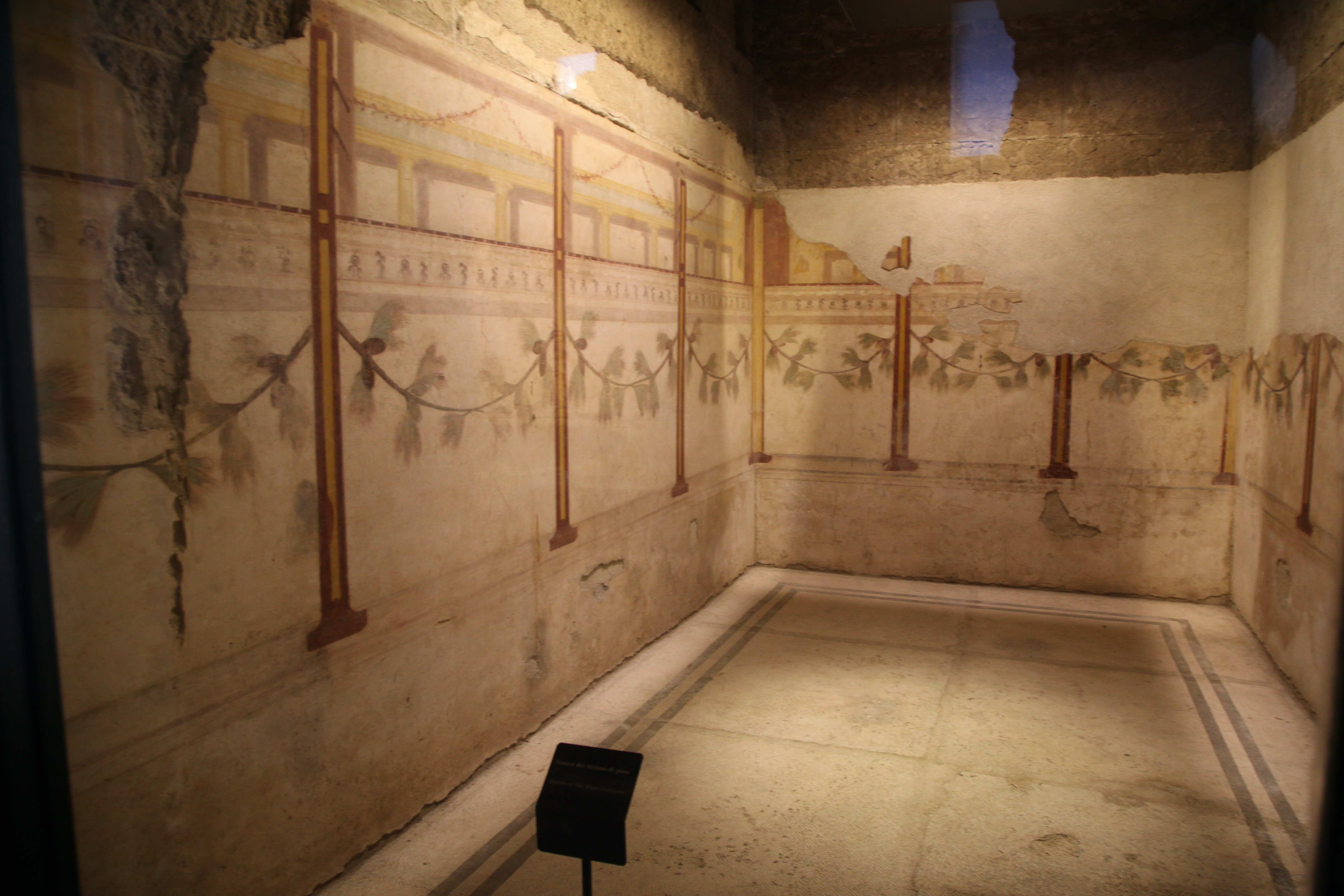 The entrance wall once showed the myth of Polyphemus and Galatea, though sadly this fresco has not survived. On both sides of the room, the painted columns frame architectural vistas and fantasy landscapes, enriched with decorative motifs such as sphinxes, winged figures, and delicate candelabra. In the next room, the walls are adorned with garlands and festoons of fruit, again framed by elegant columns and intricate architectural designs. Along the top of the wall runs a painted frieze, executed in a light, sketch-like technique. Its Egyptian-style motifs, softened by the use of highlights and shading, create a dreamy, almost ethereal effect that adds to the sense of refinement and imagination throughout the house.