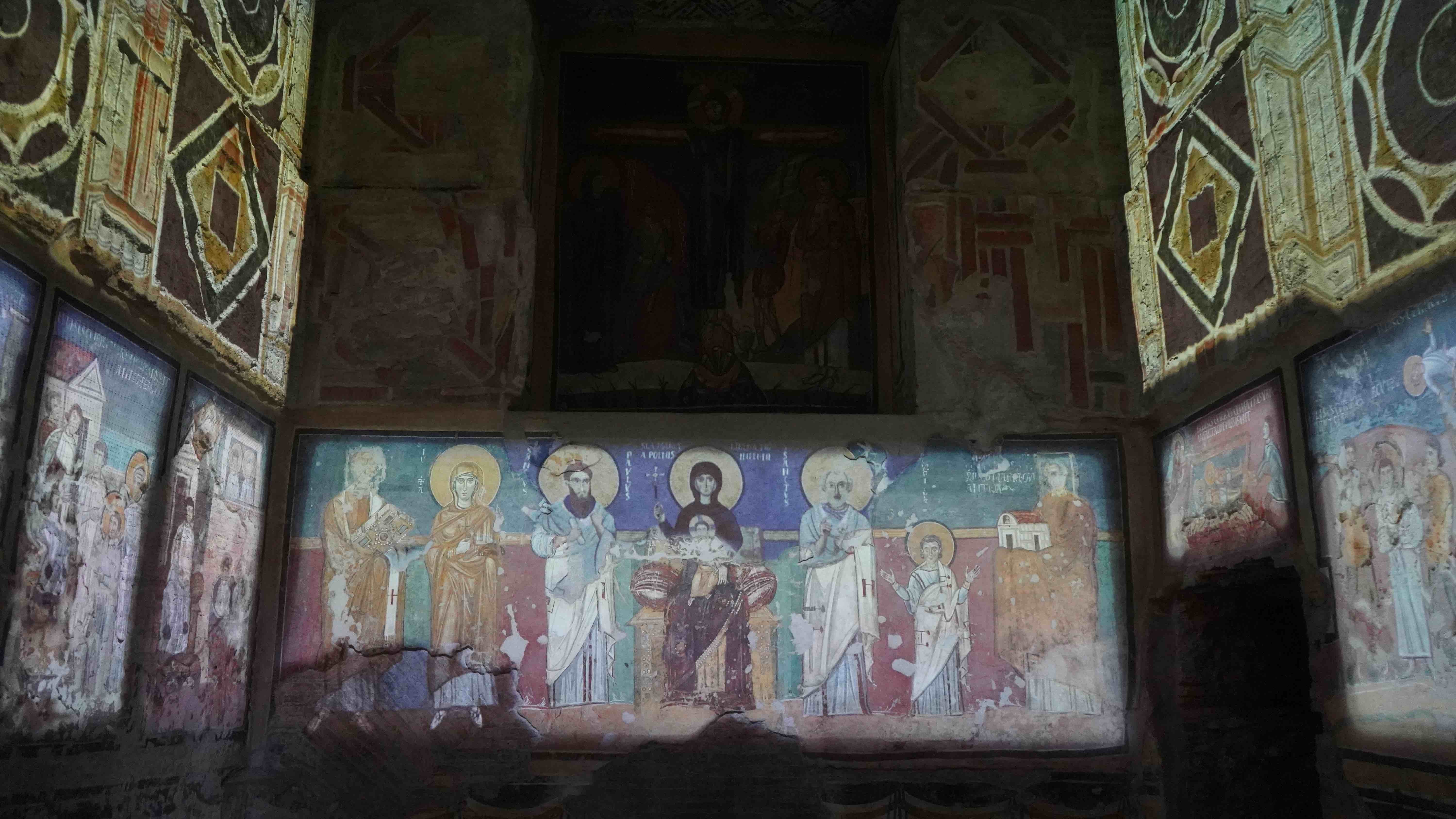 La chiesa è particolarmente rinomata per i suoi affreschi, che risalgono al periodo compreso tra il VI e il IX secolo e forniscono una rara cronologia visiva delle mutevoli prospettive artistiche e teologiche. Tra i più importanti c'è l'affresco della Vergine Maria come “Regina Coeli” (Regina del Cielo), un'immagine significativa della prima devozione mariana. L'abside presenta un'impressionante raffigurazione del Cristo Pantocratore, un tema comune nell'arte bizantina che sottolinea l'autorità divina di Cristo. Altri affreschi raffigurano santi, martiri e scene dell'Antico e del Nuovo Testamento, compresa la rara rappresentazione del “Muro Palinsesto”, in cui più strati di affreschi si sovrappongono, illustrando l'evoluzione degli stili e dell'iconografia nel corso dei secoli.